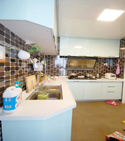 開放式的廚房能節(jié)省不少空間,蘋果綠色很漂亮,桌靠墻擺放 留出的過道恰恰好。