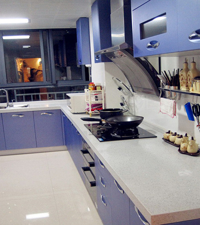 其實白色的吸塑櫥柜與藍色的石英石臺面,結(jié)合得相當(dāng)美。