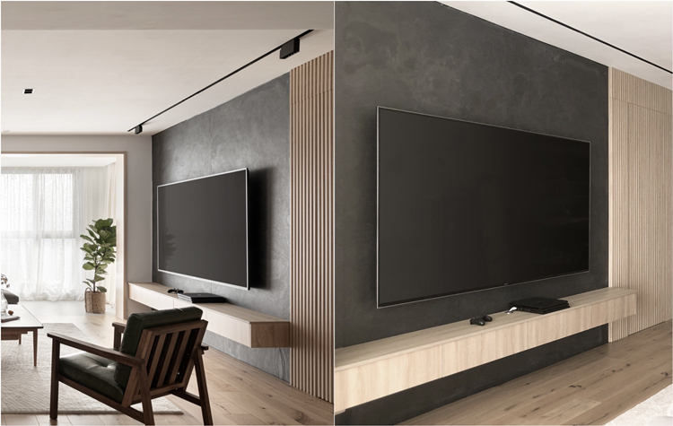 深灰色石材薄板做為電視背景墻,簡約大氣,搭配原木色格柵板,溫潤木質(zhì)與高級灰的搭配,讓人感到溫馨和放松。