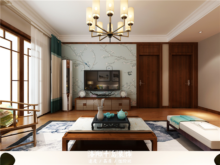 本案例僅過(guò)道位置設(shè)計(jì)了吊頂,客廳采用疊級(jí)石膏板結(jié)合石膏線(xiàn),沒(méi)有過(guò)多繁瑣的設(shè)計(jì)。電視墻位置較小,通過(guò)線(xiàn)條造型,將臥室門(mén)融入電視墻中,整體大氣美觀(guān)。整體色調(diào)素雅,搭配新中式實(shí)木家具,韻味十足。