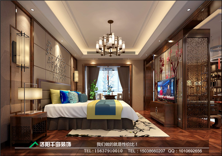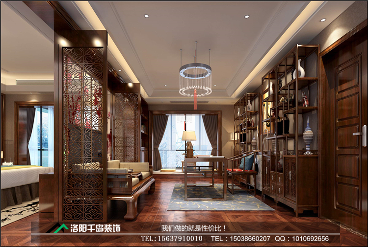 臥室就是個人休息的地方,所以在用色方面盡量穩(wěn)重而不跳躍,讓人能靜下心來,床頭的中式木花格配合荷花形狀裝飾品體現(xiàn)中式韻味。另外主臥室與書房之間鏤空花格隔斷,茶色與木色是書房的主調(diào),虛實有致的結(jié)構(gòu)讓小空間也充滿趣味。洛陽開元名郡225㎡復式新中式裝修案例@二樓臥室兼書房