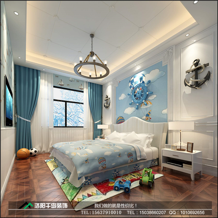 兒童房被設置在了二層。兒童房海藍色與卡通元素的點綴,讓男生的空間充滿了活躍的氣息。洛陽開元名郡225㎡復式新中式裝修案例@二樓兒童房