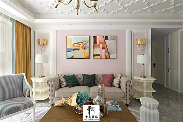 進(jìn)入客廳是淡粉色的墻面,搭配金色的窗簾,以及幾何的裝飾畫(huà),來(lái)點(diǎn)綴空間從而使空間的色調(diào)更加的豐富。