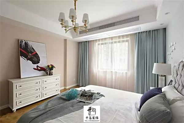 主臥的設(shè)計(jì)繼續(xù)延續(xù)素雅,這樣的睡眠空間更好的入睡。馬頭的裝飾畫(huà)為空間營(yíng)造出一份藝術(shù)的氛圍。