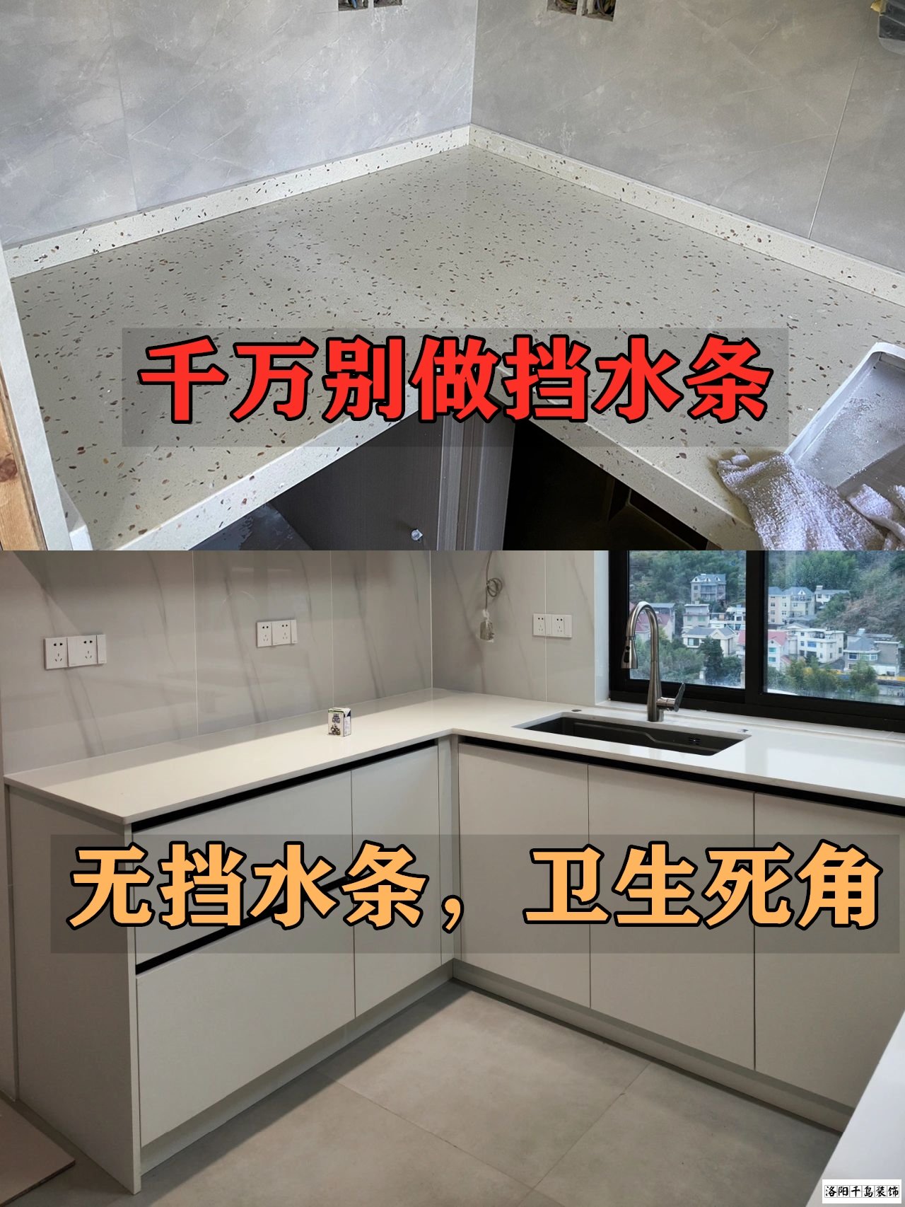 首先,臺面不要再做這種擋水條了,多兩到膠,時間久了肯定會受潮發(fā)黑的,根本清理不干凈。它的作用其實就是遮墻和柜子之間的縫隙,我們只要在瓦工階段囑咐好工人師傅把墻貼平,像這樣不做擋水條,衛(wèi)生死角少了不說,臺面又寬兩公分。