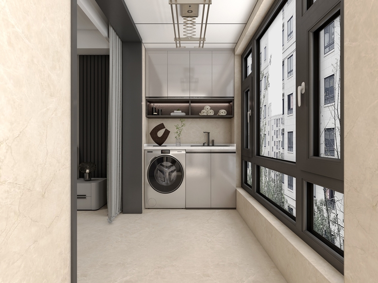 第五,陽臺的一側(cè)做儲物柜,把你換季的鞋子衣服搞里頭,另一側(cè)做一個帶搓衣板的洗手池,夏天的小衣服手搓手洗很方便,提醒一下吊柜做到頂,這樣空間利用不浪費。