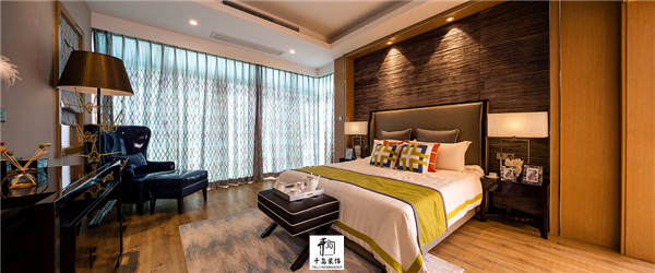 主臥室可以選擇對比圖案并且有絲綢感的窗簾及布藝。其中藍(lán)色造型的布料可以做大面積窗簾使用,那么整個(gè)臥室的感覺就是比較奢華,而且舒適。