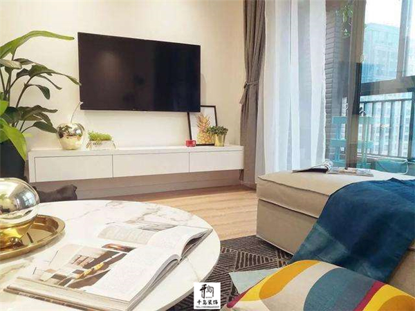 與傳統(tǒng)的落地電視柜不同,這里設(shè)計了懸掛式的白色電視柜,簡約時尚,重要的還實(shí)用,旁邊的綠植很搶眼,給家里營造出一個很清新的氛圍;