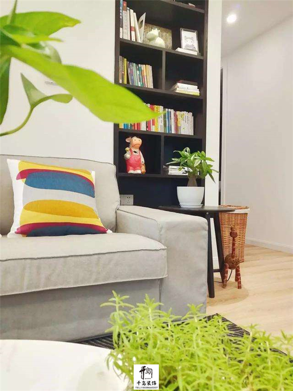 沙發(fā)墻即是在沙發(fā)的旁邊,做了一個嵌入式的壁柜,黑色的層板與白色的墻面形成一個視覺上的對比,看起來更有層次,重要的是也增加了家里的儲物需求;