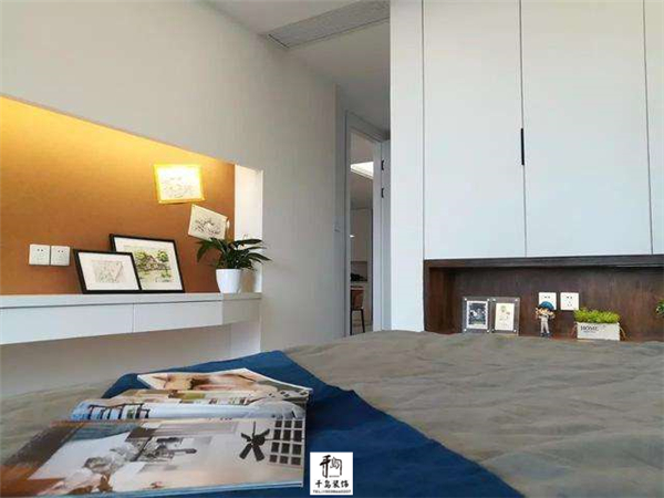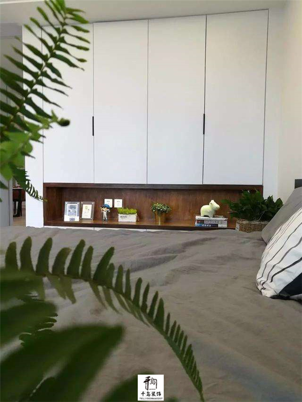 次臥延續(xù)了主臥的設(shè)計,設(shè)計了同款式的衣柜,保證了整屋風(fēng)格的統(tǒng)一性;